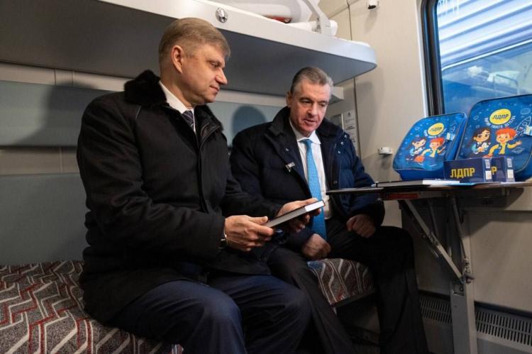 Поезд с тематическим вагоном "Россия. Жириновский" проводили в первый рейс глава РЖД Олег Белозеров и лидер ЛДПР Леонид Слуцкий. Запуск состава стал частью совместного проекта РЖД, ЛДПР и Фонда памяти и наследия Владимира Жириновского, приуроченного к 80‑летию со дня рождения политика.
