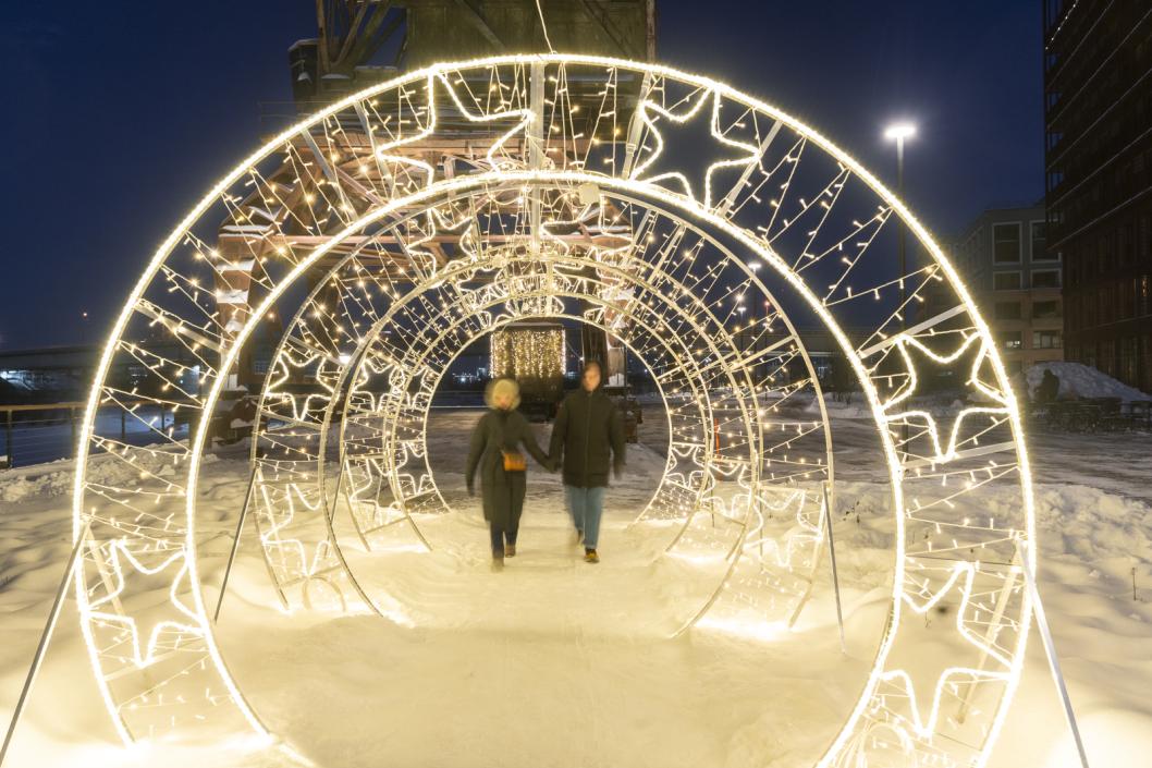 Сейчас часть набережной украшена светящимися инсталляциями: здесь можно сделать красивые зимние фотографии. Набережная открыта для всех горожан.